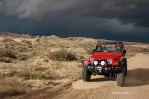Years ago, I was exploring the wash with good friends when a storm built faster than anything I’d ever seen. The sky went black. The wind roared. And the sandy wash turned into a churning chocolate river. As we were racing out of the wash, my buddy’s wife called me on the radio and asked, “What do we do if the flood water catches up with us?” All I could offer was, “Stay on the gas, roll up the windows, and hang on!” Of course, I was trying to be cute and not make the situation worse. We barely escaped before the flash flood closed the trail behind us. If there’s one desert lesson carved in stone, Black Dragon Wash can bite.